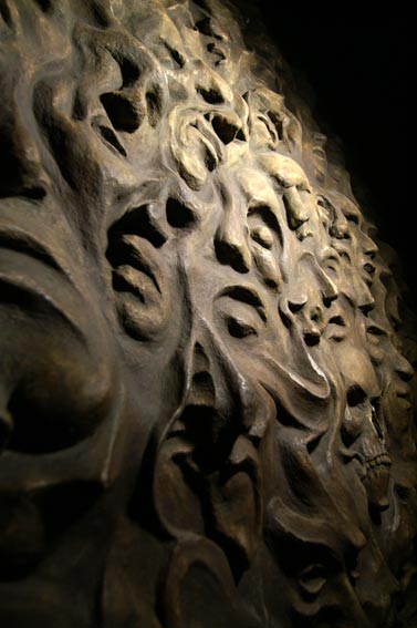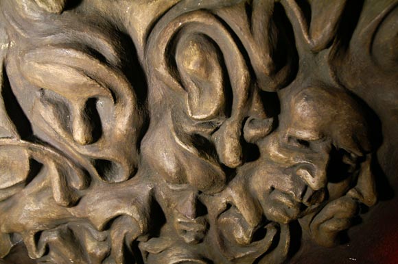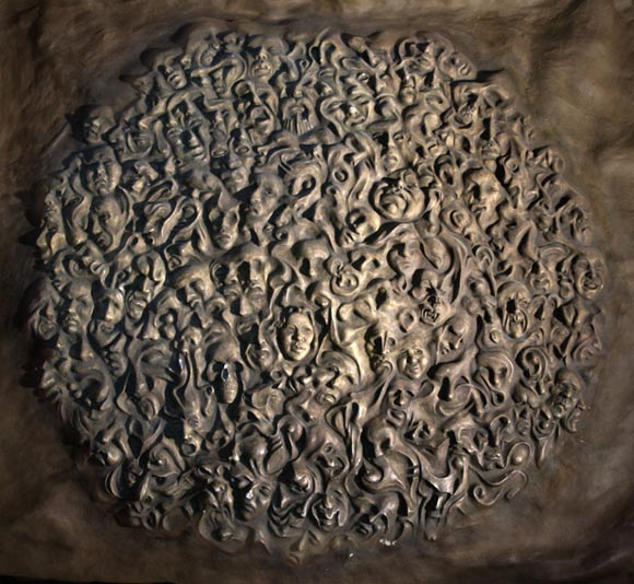 SLOW-Rondell: halbplastische Wandgestaltung (Jugendkulturzentrum Glad-House, Straße der Jugend 16, 03046 Cottbus) Putzmörtel bemalt Durchmesser: ca. 2,10 m 1995