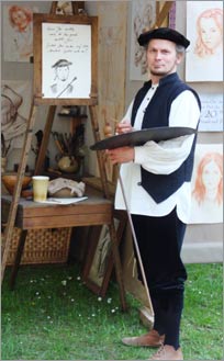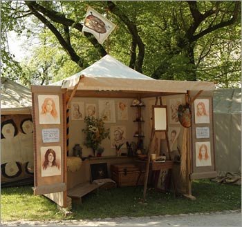 Seid 1998 trete ich auf Mittelaltermärkten als Schauhandwerker auf. In einem entsprechend gestalteten Arbeitsstand zeige ich mittelalterliche Malerei und Grafik.