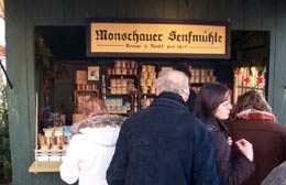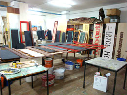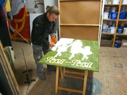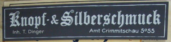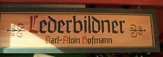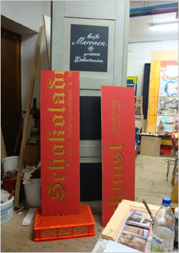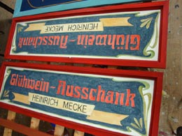 Diese Schilder entstanden für den historischen Weihnachtsmarkt auf dem Dresdener Neumarkt in großer Zahl (68) in relativ kurzer Zeit. Zusätzlich war ich mit der Farbgebung der 60 Marktstände betraut. Ich mischte die Farben nach eignem Entwurf zum Großteil selbst, leitete die Anstricharbeiten und versah den größten Teil der Stände zusätzlich mit Lasuren - eine Akkordarbeit, bei der eine Qualität erreicht wurde, die innerhalb des Gesamtkonzepts des Marktes eine historisch überzeugende ist.