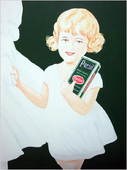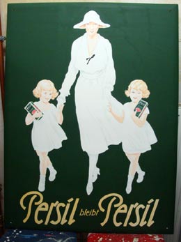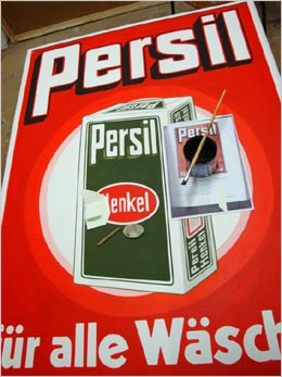 Kopie eines historischen Werbeschilds der Firma Henkel als EmailleschildImitation auf formgeschliffener Faserplatte mit anschließender Hochglanz-versiegelung